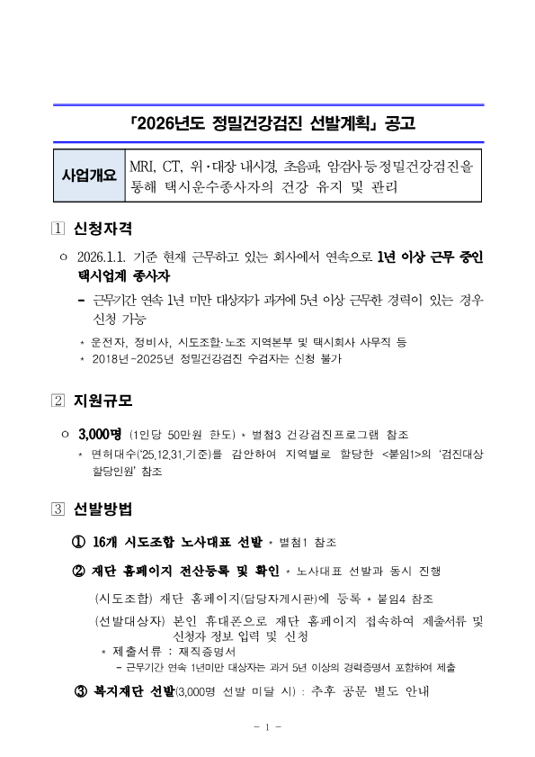 (택시 복지재단) 2026년도 정밀건강검진 선발계획 공고 안내